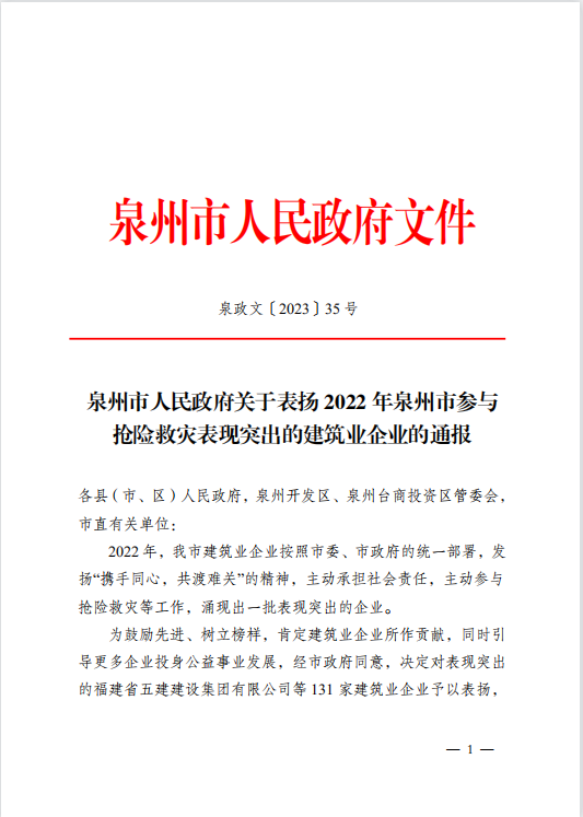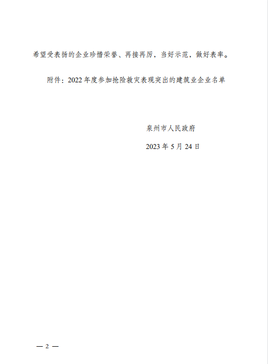 近日,泉州市人民政府發布《關于表揚2022年泉州市參與搶險救災表現突出的建筑企業的通報》,博亞(福建)建筑設計有限公司榜上有名,這是公司繼2022年榮獲泉州市“企業社會責任獎”之后因主動承擔社會責任,主動參與搶險救災等工作受到政府的通報表揚。