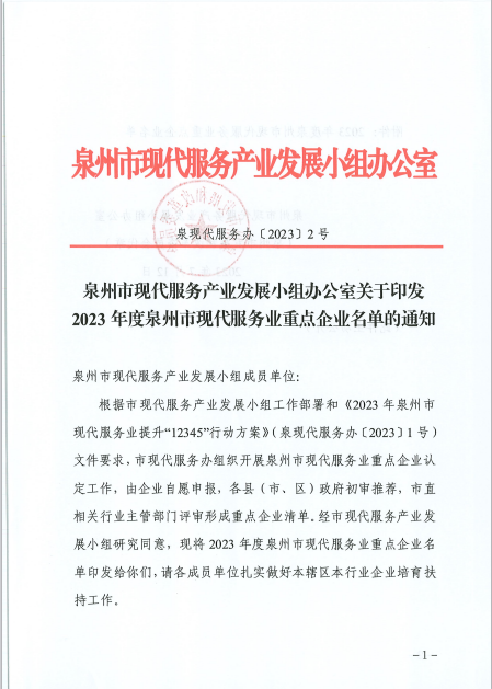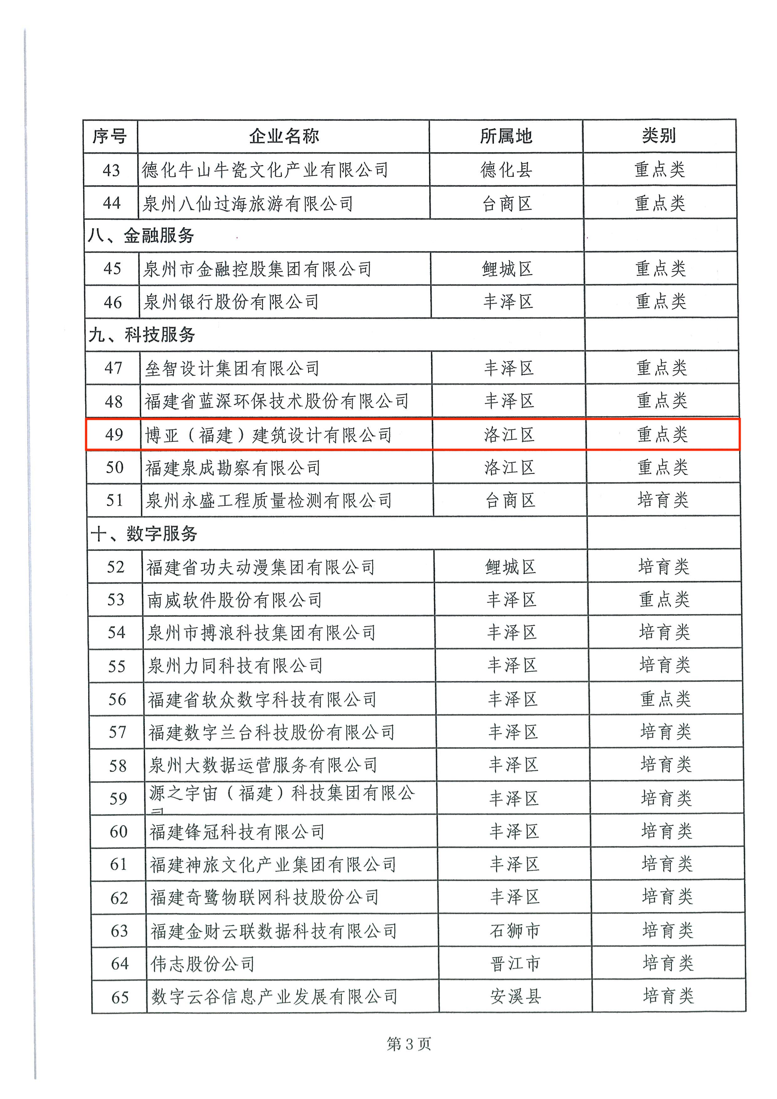 2023年7月12日,經(jīng)洛江區(qū)政府初審推薦、行業(yè)主管部門評審和泉州市現(xiàn)代服務產(chǎn)業(yè)發(fā)展小組研究,公布了2023年度泉州市現(xiàn)代服務業(yè)重點企業(yè)名單,博亞(福建)建筑設計有限公司獲泉州市“現(xiàn)代服務業(yè)重點企業(yè)”認定。這是公司繼2021年獲“泉州市第三產(chǎn)業(yè)龍頭企業(yè)”、2022年獲“泉州市建筑業(yè)準龍頭企業(yè)”稱號后,再一次獲得市政府和行業(yè)主管部門的肯定。