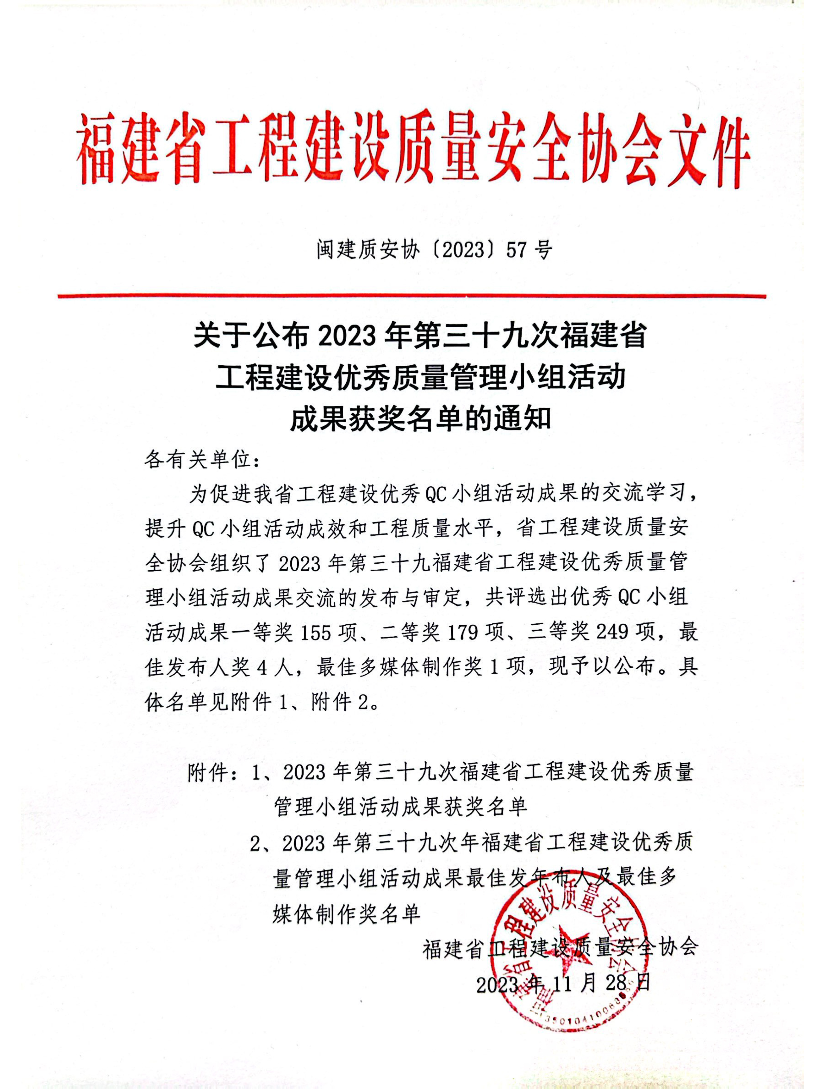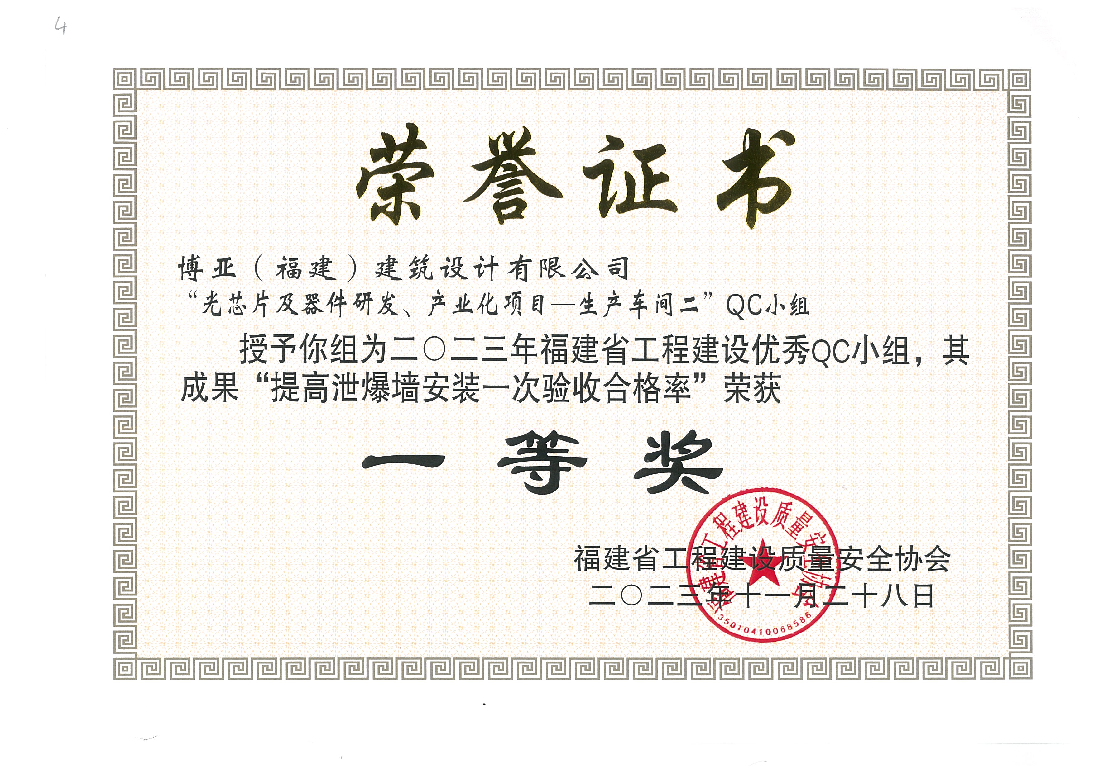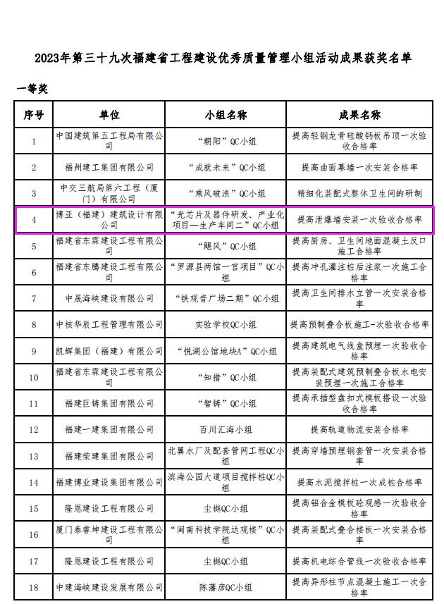 2023年11月28日,省建設工程質量安全協會組織的2023年第三十九次福建省工程建設優秀質量管理小組活動成果交流,經過發布、評選、審定等一系列流程后最終公布獲獎名單。博亞(福建)建筑設計有限公司報送的“光芯片及器件研發、產業化項目—生產車間二”QC小組課題“提高泄爆墻安裝一次驗收合格率”榮獲一等獎!